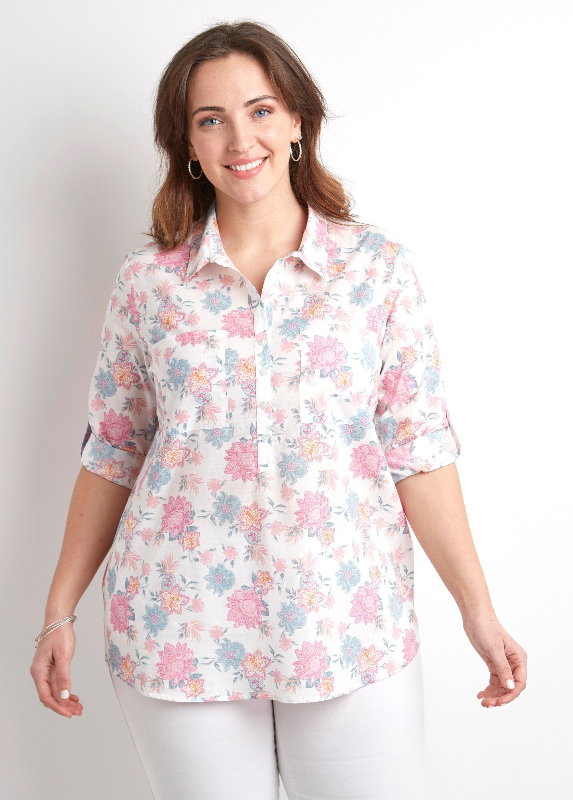 Algodão fresco e estampa floral para uma blusa confortável. Seu corte clássico também é muito feminino, com gola pontuda, carcela com botões, bolsos de aplicação no peito e mangas 3/4 ajustáveis com carcela e punhos abotoados. Canga traseira e base reta.
