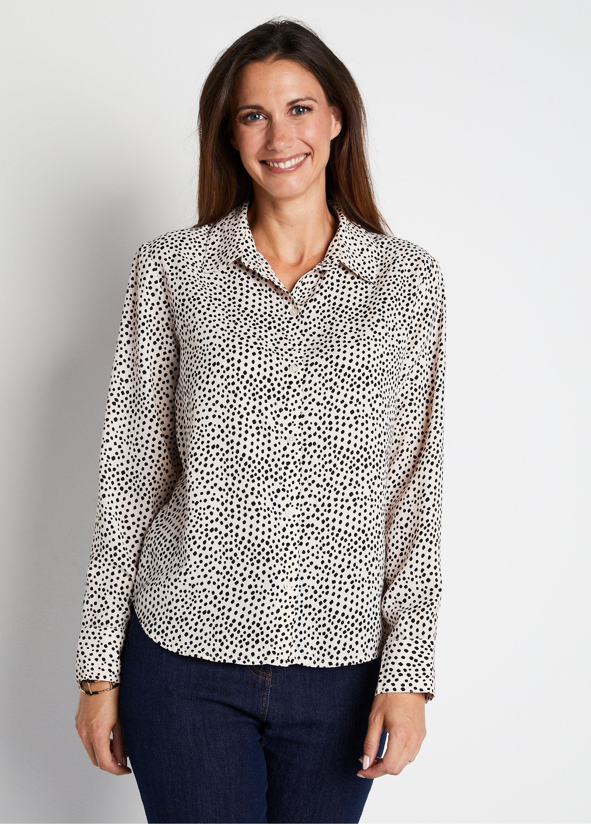 Com estampa de bolinhas, tecido fluido e corte reto, a blusa é a parceira ideal para silhuetas dinâmicas e femininas. Totalmente abotoado na frente. Gola pontuda. Mangas compridas, punhos abotoados. Base ligeiramente arredondada.
