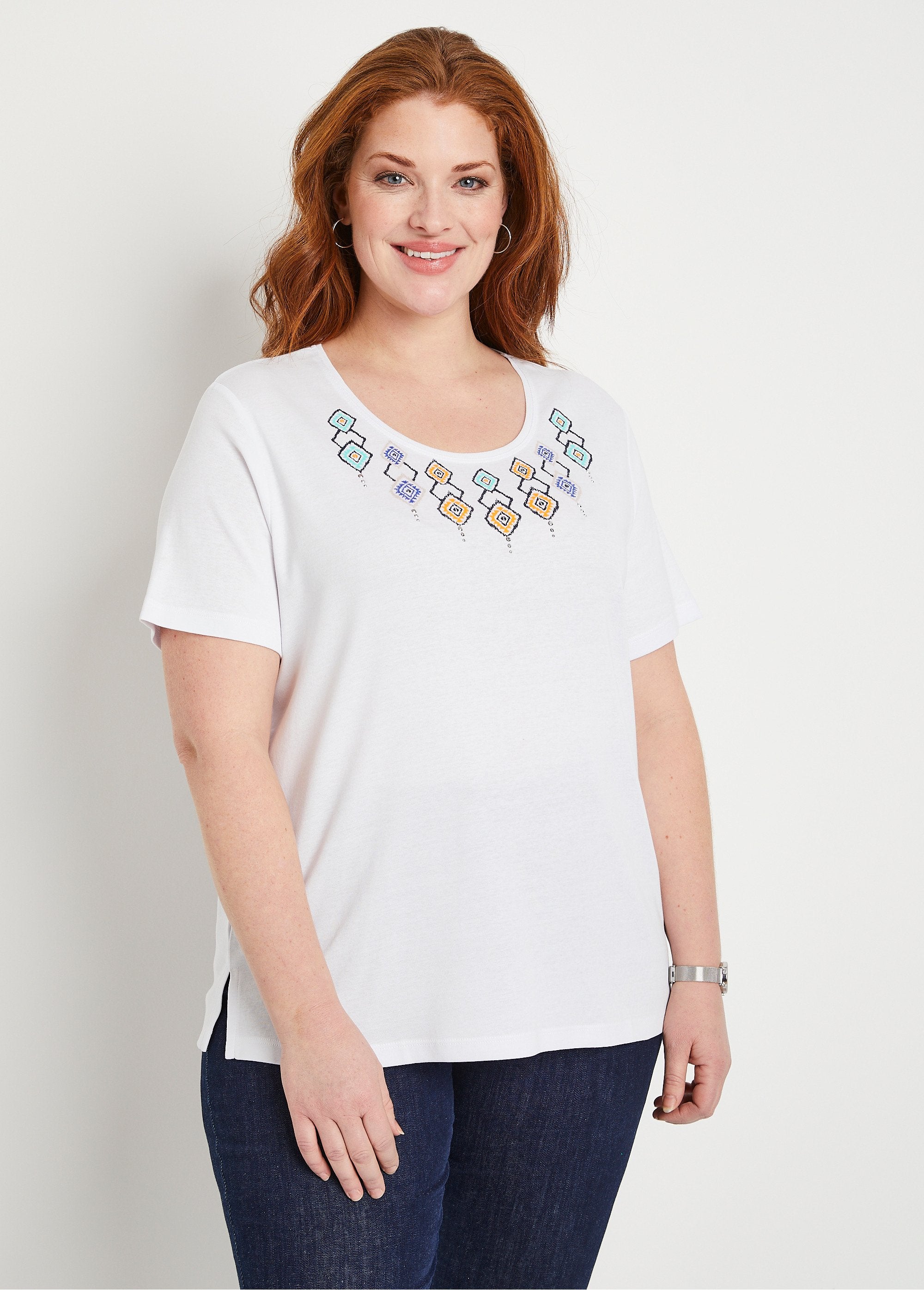 Um formato confortável e 2 materiais para a camiseta disponível em 2 lindas versões. Viés no decote redondo. Manga curta. Lados divididos na base.